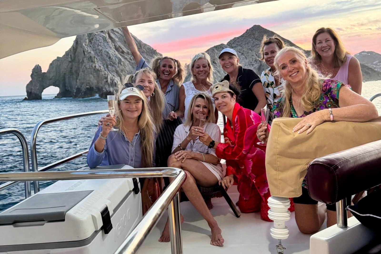The women arrived at Cabo San Lucas marina and boarded Patron on the dock in front of Solomon’s Landing. After being greeted by Captain Sebastian, they were shown the cabins on the lower deck and given the opportunity to stow their gear and change into their pajamas. The Ladies’ Night had been planned so that the yacht could cruise out to Lands End and the arches to be able to watch the incredible sunset over the Sea of Cortez and the Pacific Ocean.