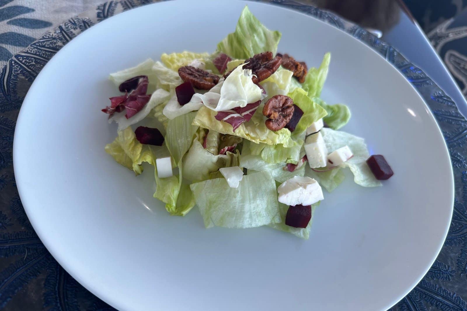 The dining table on the main deck is set with beautiful place settings and glasses for the dinner. Guests work out the dinner that they would like based on food preferences and any dietary restrictions. In this case, the first course is a salad with romaine lettuce, walnuts and feta cheese served with a choice of dressings. The appetizer for the meal is shrimp in an aguachile sauce with avocado, cucumber, tomatoes and shredded carrots, and fresh crackers. As the appetizers are enjoyed, the guests watch a helicopter take off from the deck of one of the yachts anchored near the Rui in Cabo San Lucas. The sun starts to set in the west as the guests take a small break before the main course. The main course is the Catch-of-the-Day, Cabrilla, which is similar to Sea Bass. The grilled fish is served with mashed potatoes, cubed avocado, carrots, broccoli, and asparagus. Each of the guests have their choice of wine or cocktails to complement the dinner prepared on board by Chef Antonio. The final course is a light white cake. After eating, the guests enjoy their wine and watch as the sun sets behind the hotels and marina of Cabo San Lucas and Lands End in the other direction.