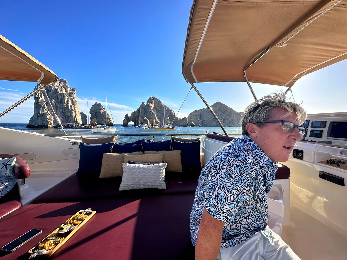 Whether on the bow in the sunshine or on the fly bridge, the views of Lands End from both the Sea of Cortez and the Pacific Ocean are spectacular. Brenda will serve you, wherever you decide to sit with wine, beer, cocktails, or soda, and snacks as you enjoy the view.